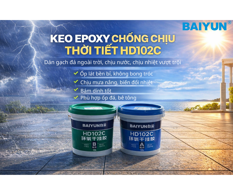 Trong điều kiện khí hậu nóng ẩm, mưa nhiều và nhiệt độ thay đổi liên tục như Việt Nam, việc lựa chọn vật liệu liên kết chất lượng cao là yếu tố quyết định tuổi thọ công trình. Keo Baiyun HD102C là dòng keo epoxy 2 thành phần được thiết kế chuyên biệt cho các hạng mục thi công ngoài trời, giúp tăng khả năng chống chịu thời tiết và đảm bảo độ bền lâu dài.