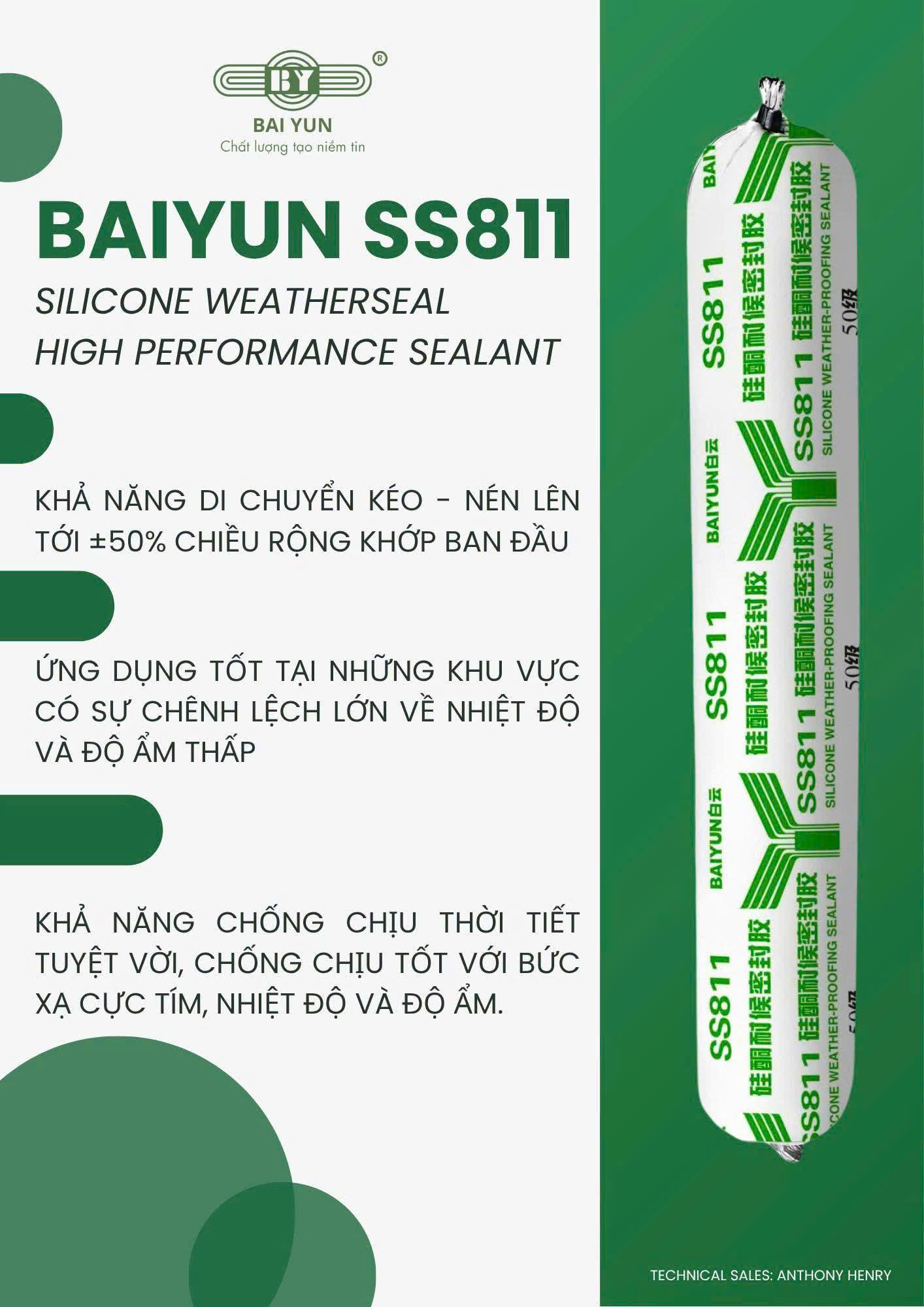 Baiyun SS811 là keo silicone chuyên dùng cho trám khe và chống chịu thời tiết. Sản phẩm có khả năng co giãn tốt, giúp duy trì độ kín khít của các khe trong quá trình sử dụng.